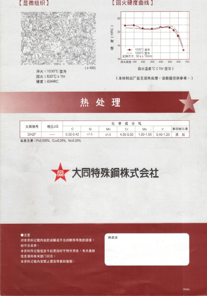 日本大同DH2F(40HRC預硬級)熱作模具鋼:預硬易切削熱作模具鋼(40HRC)